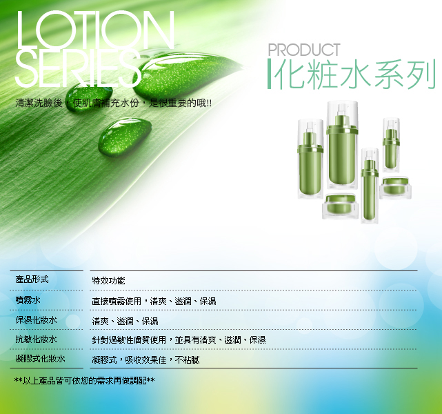 針對過敏性膚質使用,並具有清爽、滋潤、保濕功效